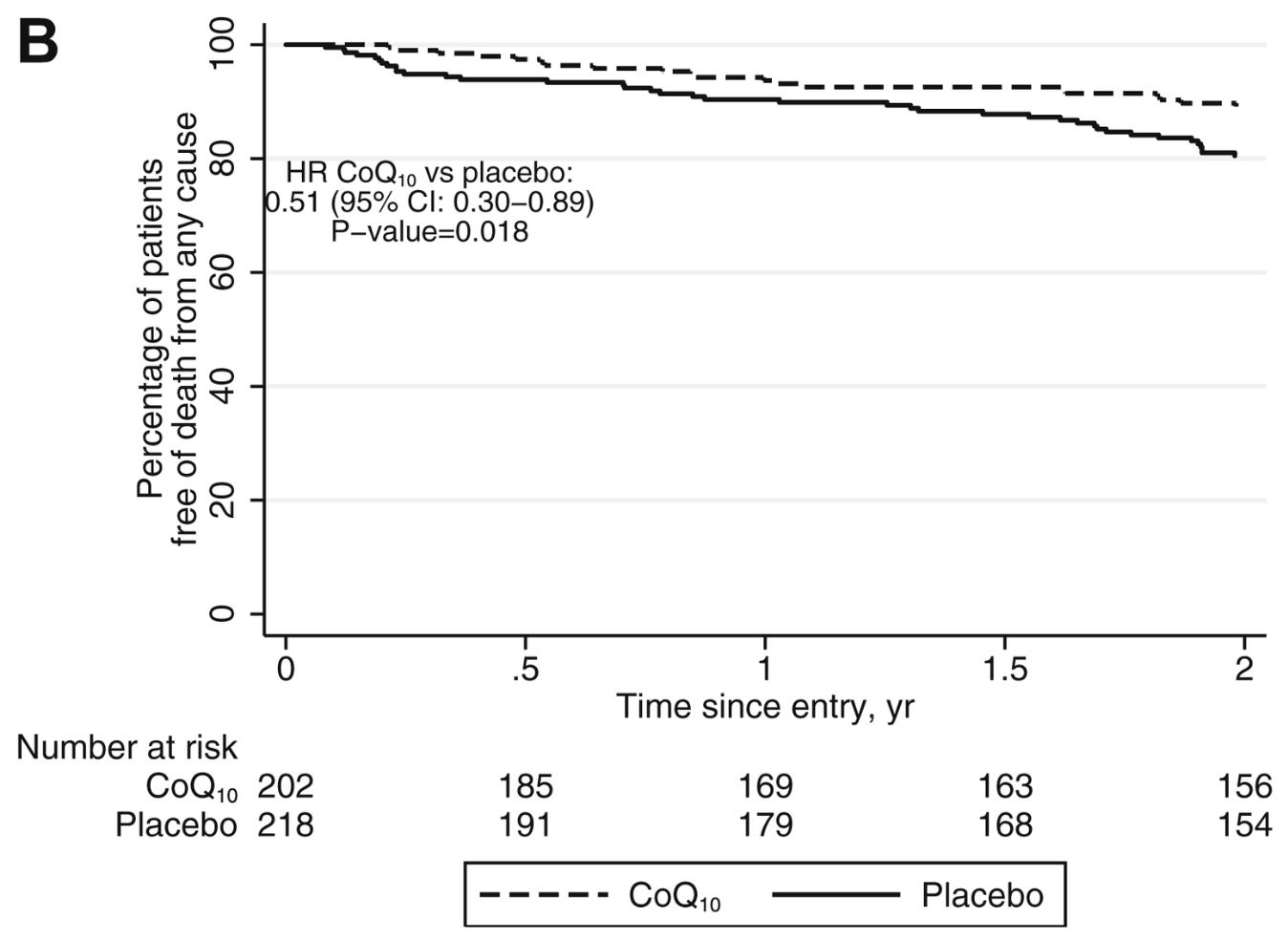 The Q-SYMBIO trial (Mortensen et al. 2014) demonstrated that 420 patients in a 2-year trial given 300 mg CoQ10 daily reduced cardiac and all-cause mortality by 44% & 42%, respectively.