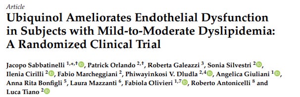 A randomized, double-blind trial (Sabbatinelli et al., 2020) gave dyslipidemic adults 100 & 200 mg/day of ubiquinol for 8 weeks. Both doses significantly improved flow-mediated dilation, a direct measure of how well your blood vessels dilate & constrict.