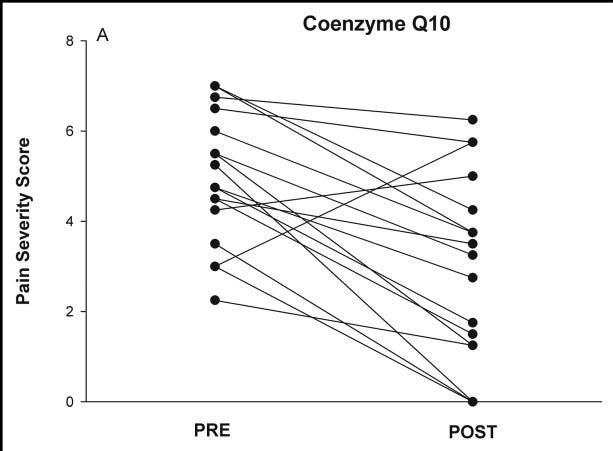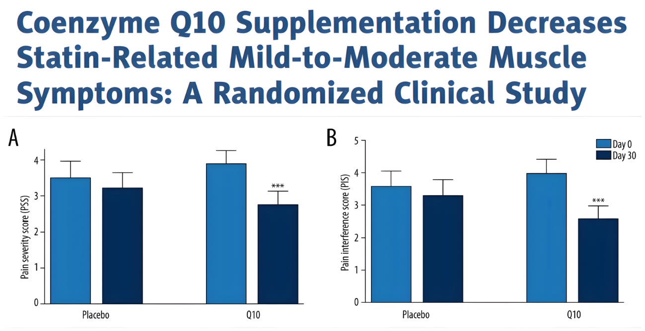 Caso et al. (2007): 100 mg/day of CoQ10 across 32 hyperlipidemic patients for 30 days significantly reduced muscle pain by 40%, compared to Vit E alone, in patients treated with statins.