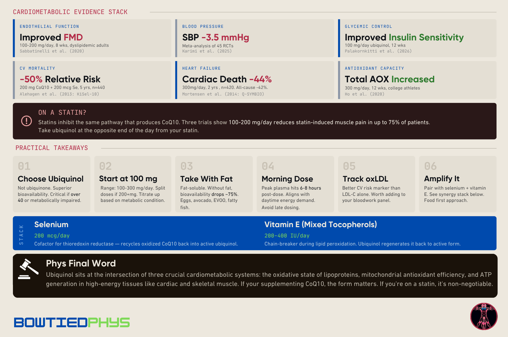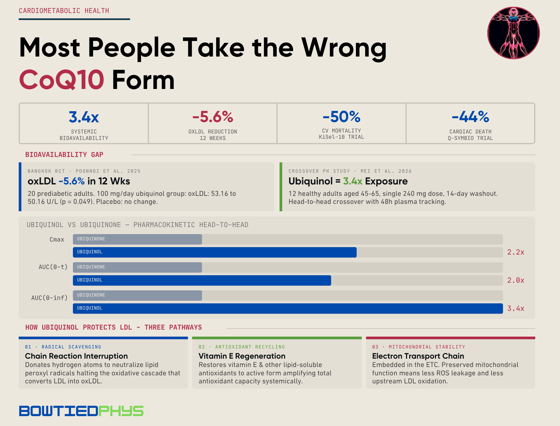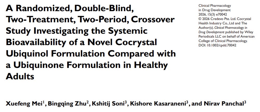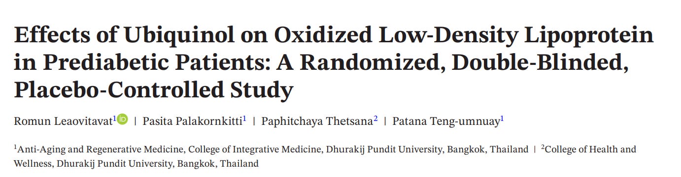 Researchers in Bangkok published a pilot RCT looking at what happens when you give adults 100 mg/day of ubiquinol for 12 weeks and studied the shifts in oxLDL as the primary outcome.