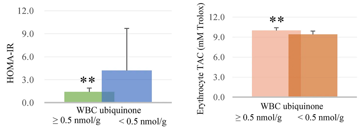 A randomized, double-blinded, placebo-controlled trial (Ho et al., 2020) gave 31 healthy college athletes 300 mg of ubiquinone/day for 12 weeks. The treatment group had improved insulin sensitivity and increased total antioxidant capacity.