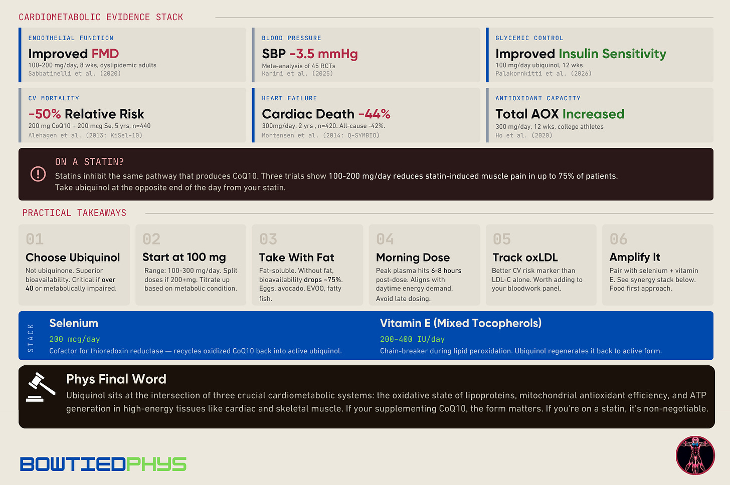 100–200 mg/day of ubiquinol taken at the opposite end of the day from your statin (morning vs. evening or vice versa) helps restore what the drug strips out. The objective is to mitigate its collateral damage on the mitochondria.