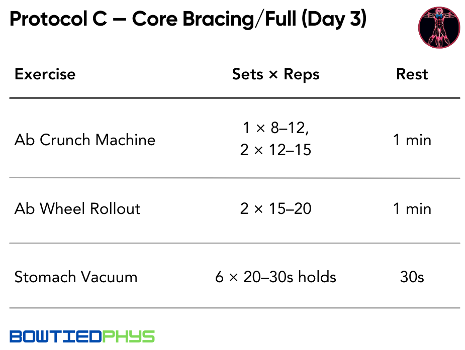 Targets the transverse abdominis — the deep stabilizer that cinches your waist tight. Golden-era bodybuilders swore by this for a narrow, controlled midsection.