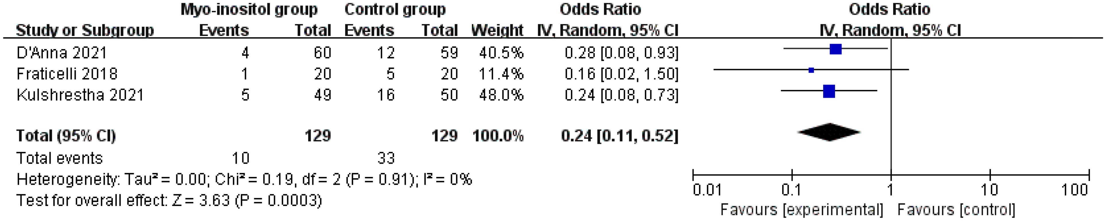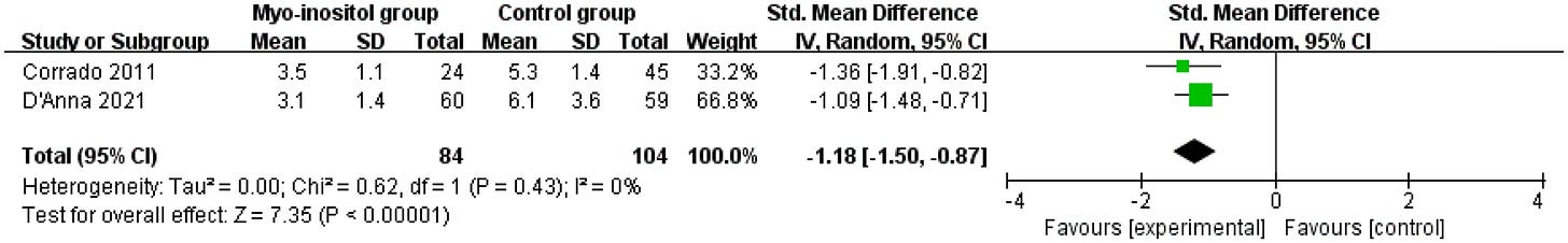By the third trimester of pregnancy, insulin sensitivity becomes significantly impaired, dropping to ~50-70% below pre-pregnancy levels. In a 2024 meta-analysis conducted across four RCTs & 327 patients, Chen et al. demonstrated myo-inositol’s ability to reduce the need for insulin therapy by 76%.