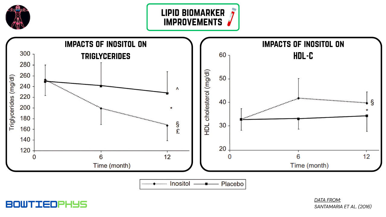 Minozzi et al. similarly found lipid improvements with a 40:1 ratio myo-inositol & D-chiro-inositol combination therapy: HDL-C increased by 45%, LDL-C reduced by 14%, & triglycerides reduced by 24%.