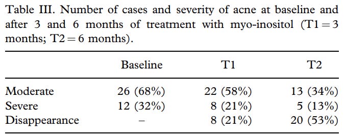 Though the primary outcome measured in this trial conducted by Zacche et al. wasn’t the control of acne, the subjects saw significant improvements in this area over the trial period. At 3 months, acne had completely resolved in 21% of patients, remained moderate in 58%, & was still severe in 21%. By 6 months, the improvement was even more pronounced - 53% of patients showing complete clearance, 34% having moderate acne, & only 13% still experiencing severe acne.