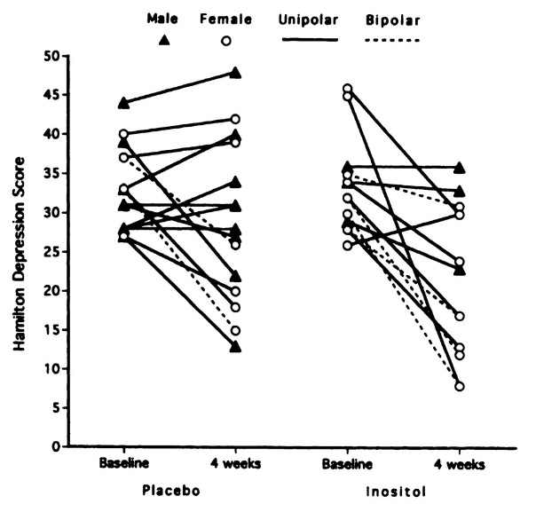 The present study is, to our knowledge, the first use of the precursor strategy for a second messenger rather than a neurotransmitter in treating depression…An important observation in the present study was the absence of manic episodes in the bipolar depressed patients treated with inositol.