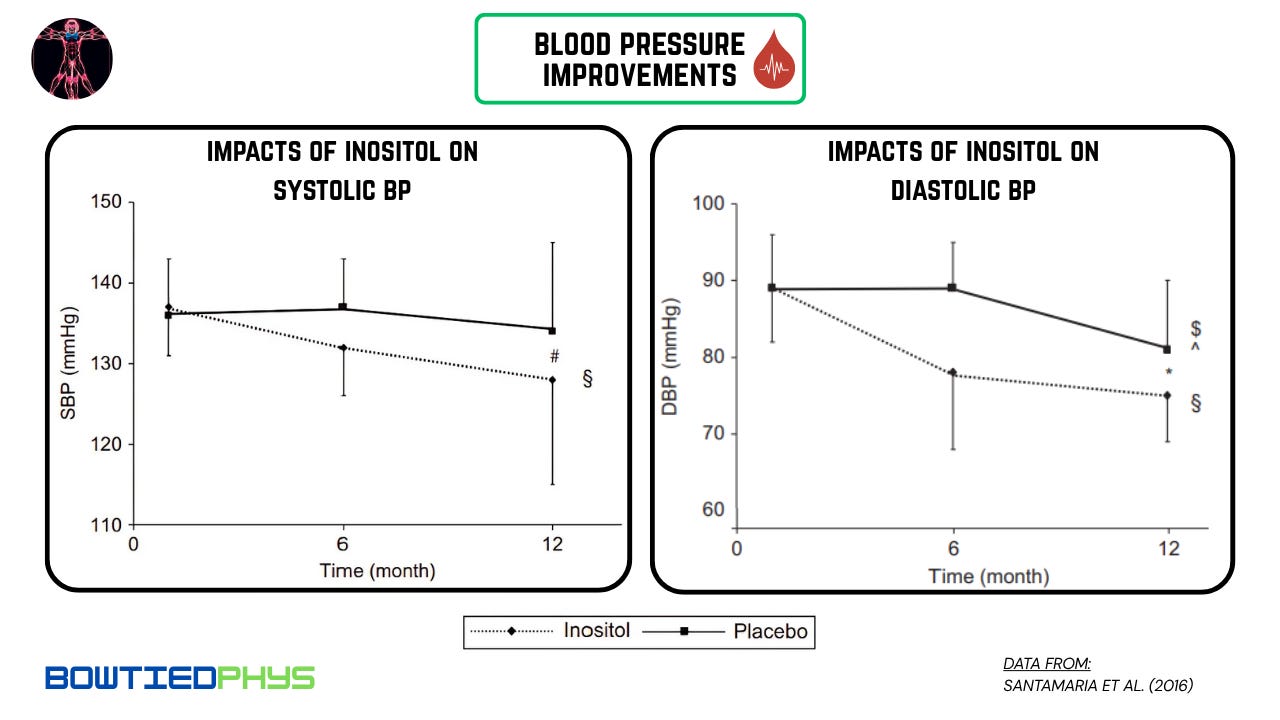 A more targeted meta-analysis by Tari et al. concurred with these findings showing the impact of inositol supplementation on blood pressure markers: reductions in systolic & diastolic by 5.7 mmHg & 7.1 mmHg, respectively. The strongest benefits were observed when taken for more than 8 weeks at 4,000 mg daily.