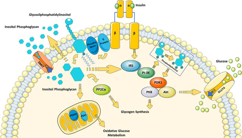 Now for a more complete breakdown on the graphic (skip if you’re not interested in the nerdy depths of the cell mechanisms): When insulin binds to its receptor (yellow structures in top center), it also activates the typical glucose pathway (right side) where insulin receptor signaling proteins trigger different pathways to move GLUT4 transporters to the cell surface for glucose uptake. The IPG pathway (left side) where membrane-bound glycosylphosphatidylinositol then gets cleaved to produce IPGs. The IPGs get tossed out of the cell → reimported via SMIT transporters → activate PP2Cα to stimulate glycogen synthesis & activate mitochondrial enzymes (like PDH complex in mitochondria) → finally we get glucose oxidation.