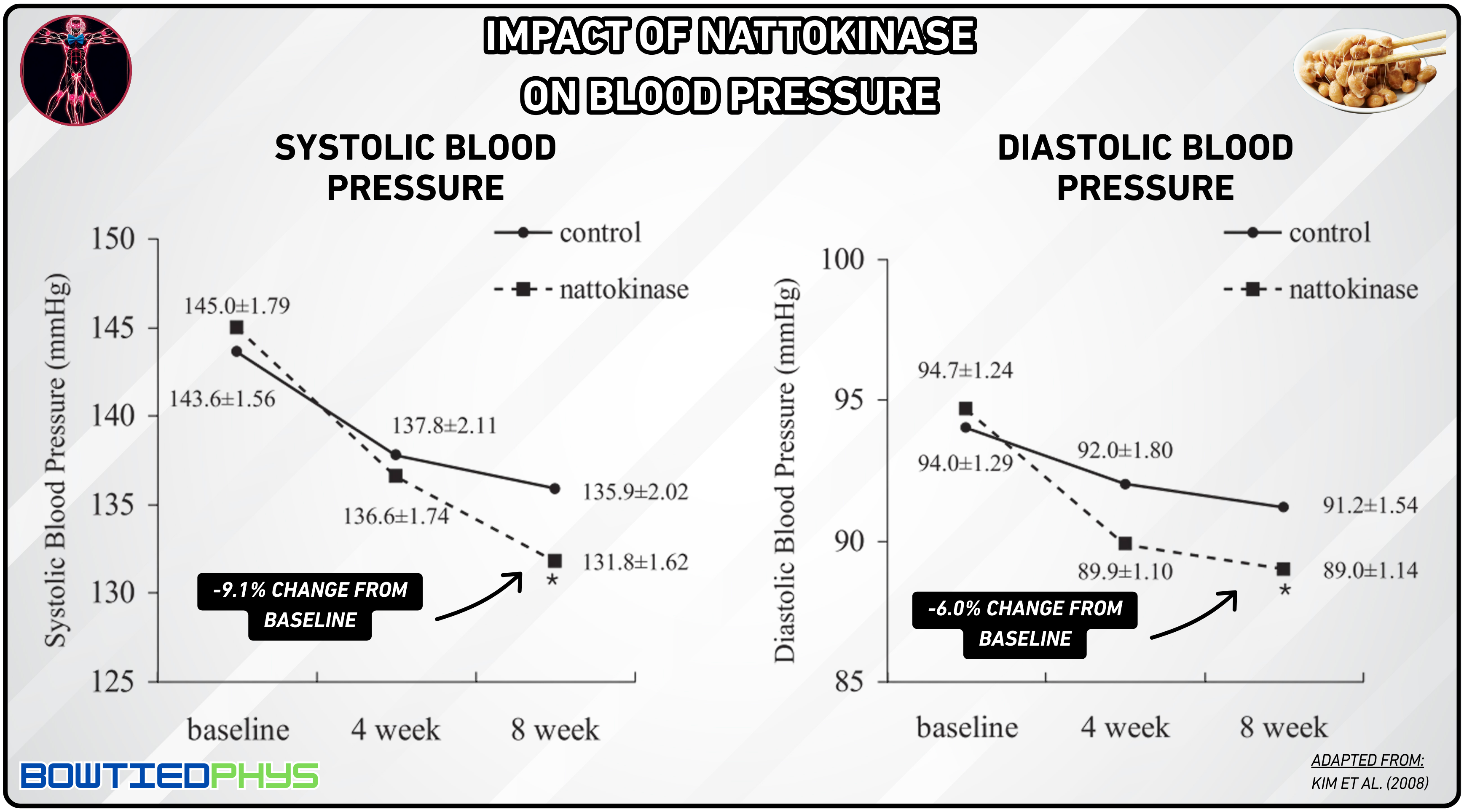 In a study by Kim et al. (2008)10, 86 participants with untreated hypertension received 2,000 FU/day of nattokinase or placebo for 8 weeks. Among the 73 completers, the nattokinase group saw significant reductions: