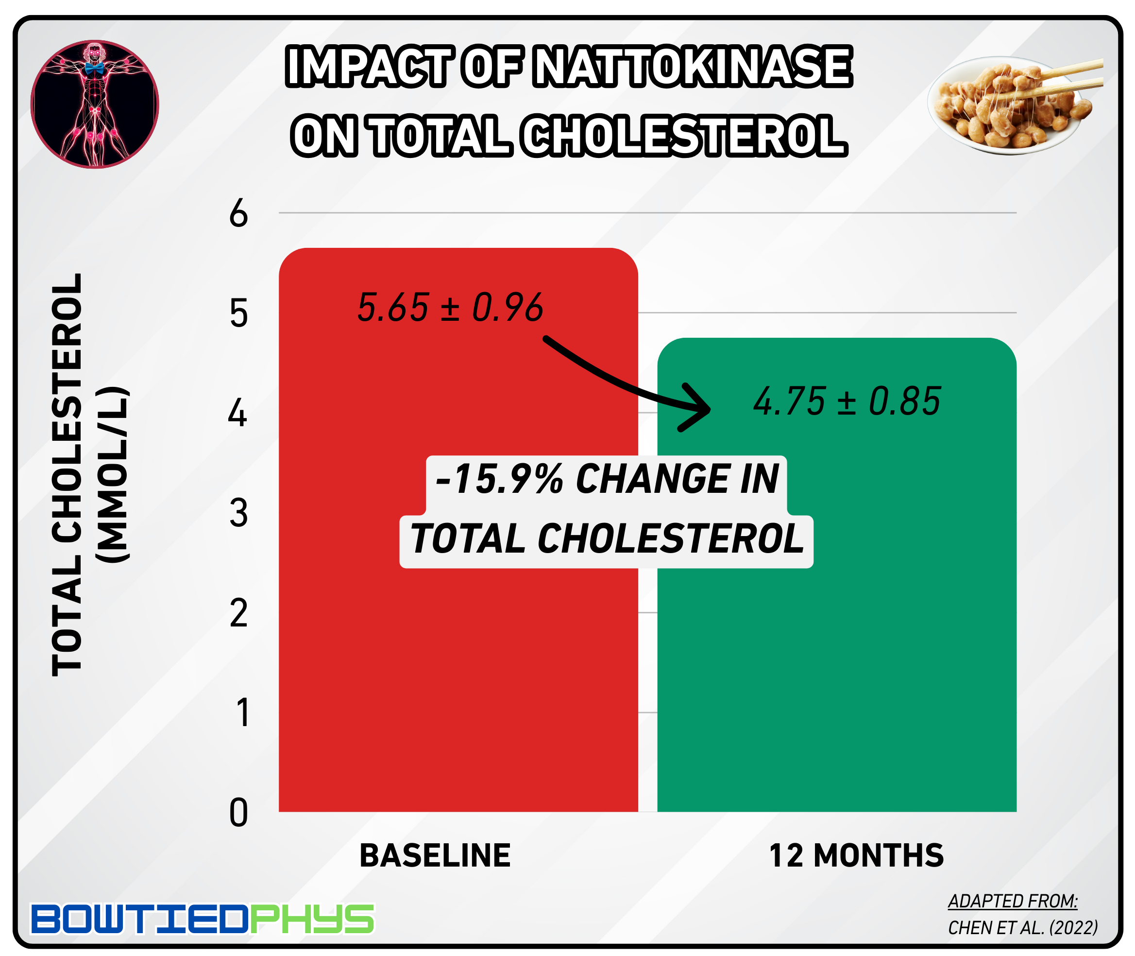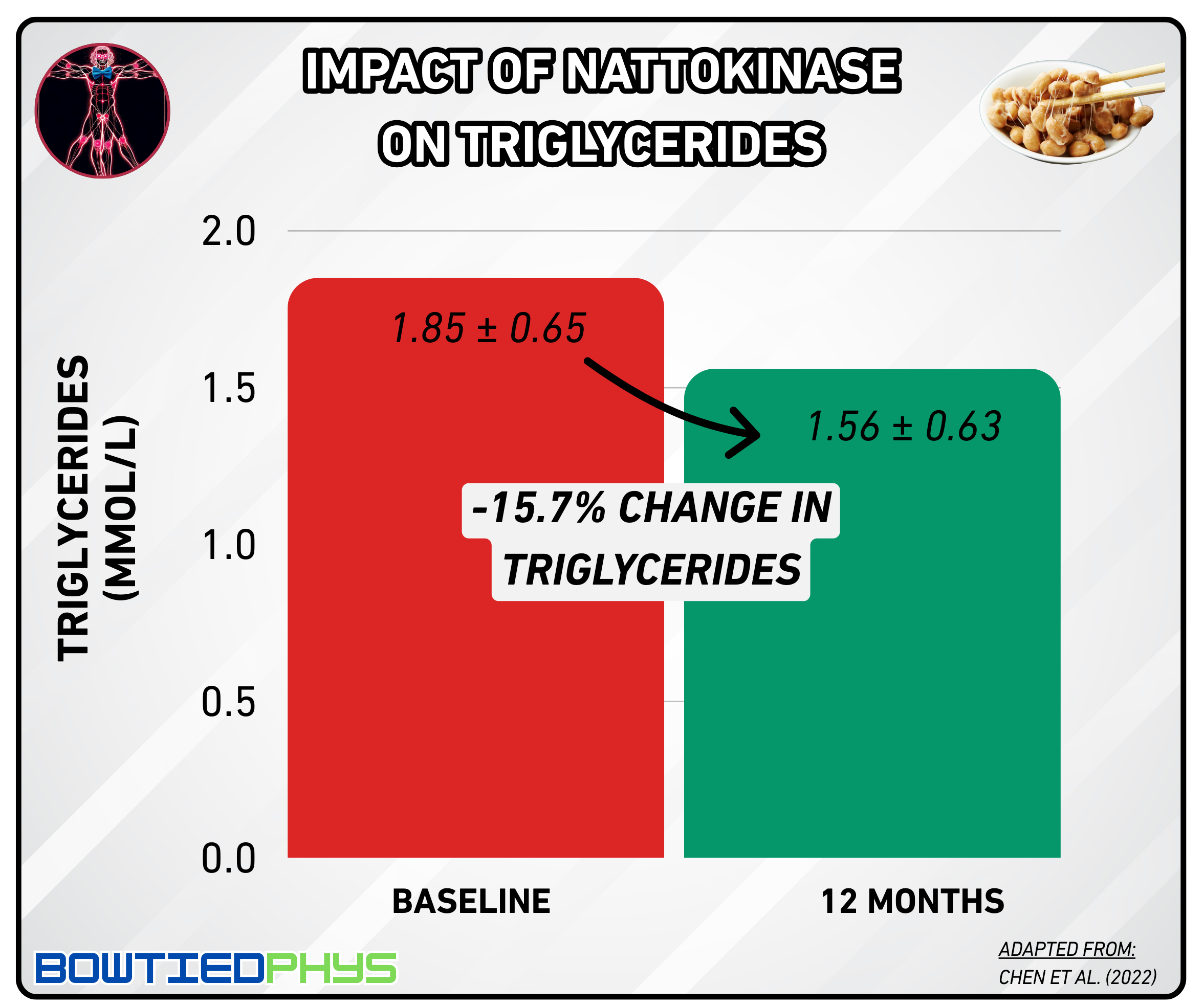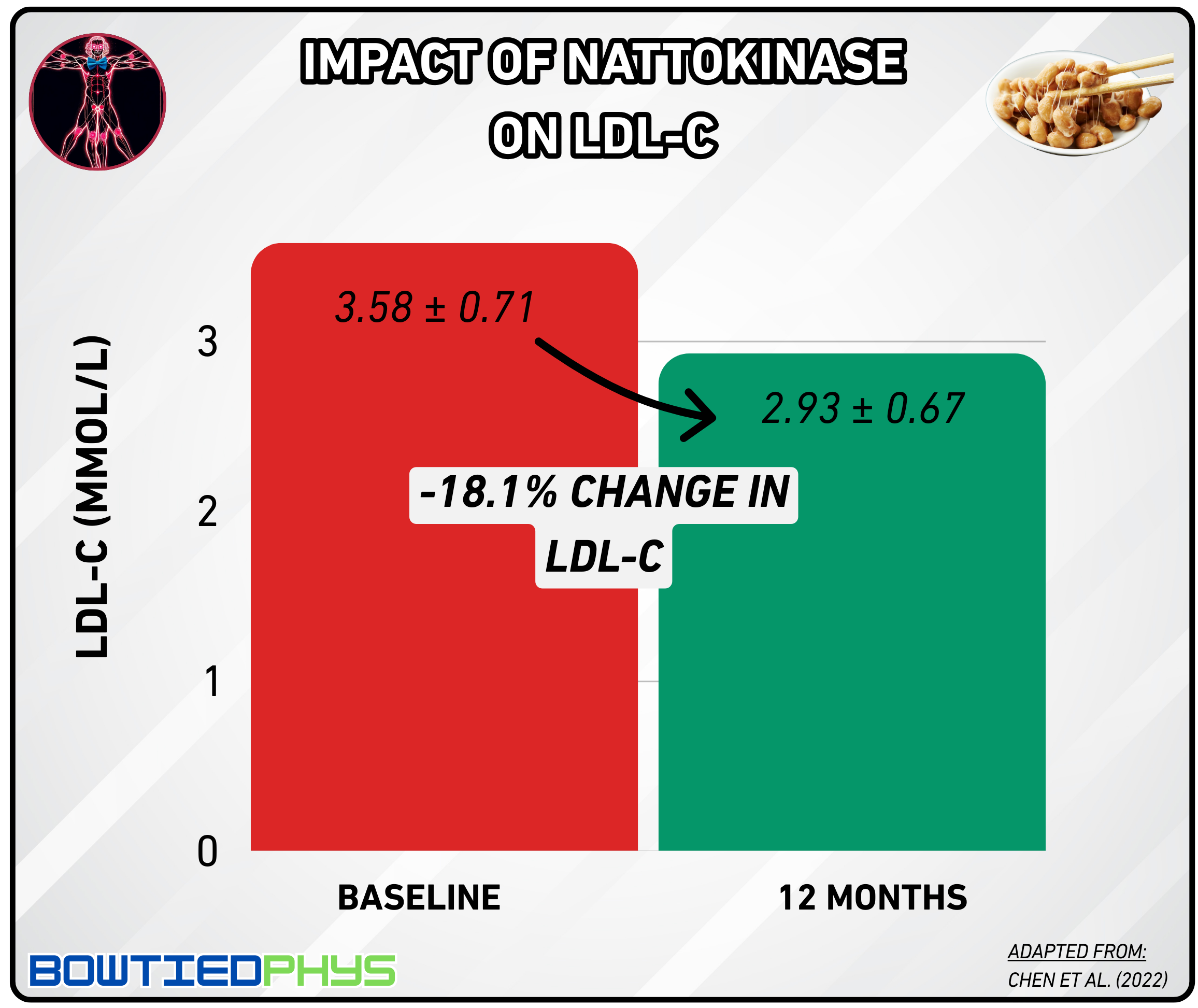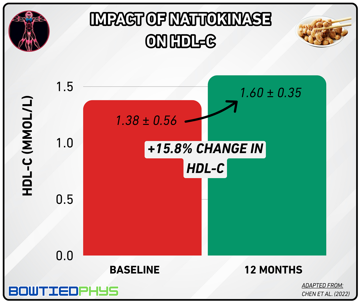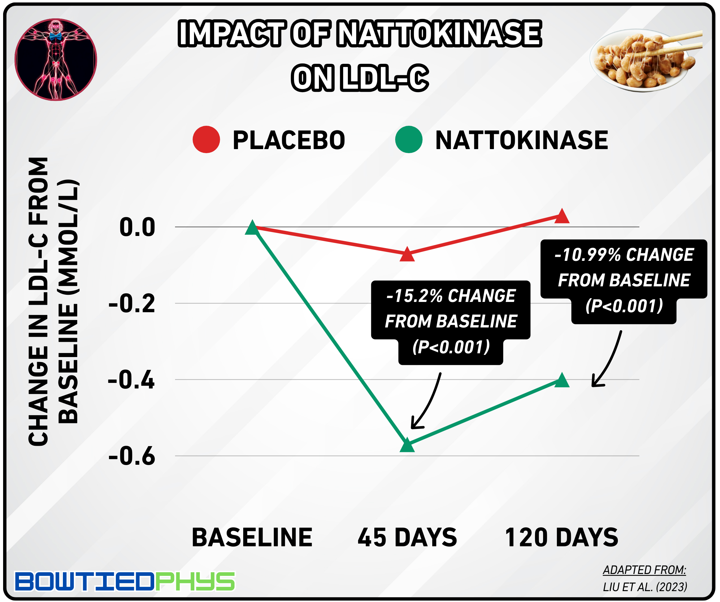 In this randomized controlled trial by Liu et al. (2023)6, 113 participants were split into nattokinase and placebo groups for 120 days. Those on nattokinase saw LDL-C levels drop by 15.2% at 45 days & 11% at 120 days.