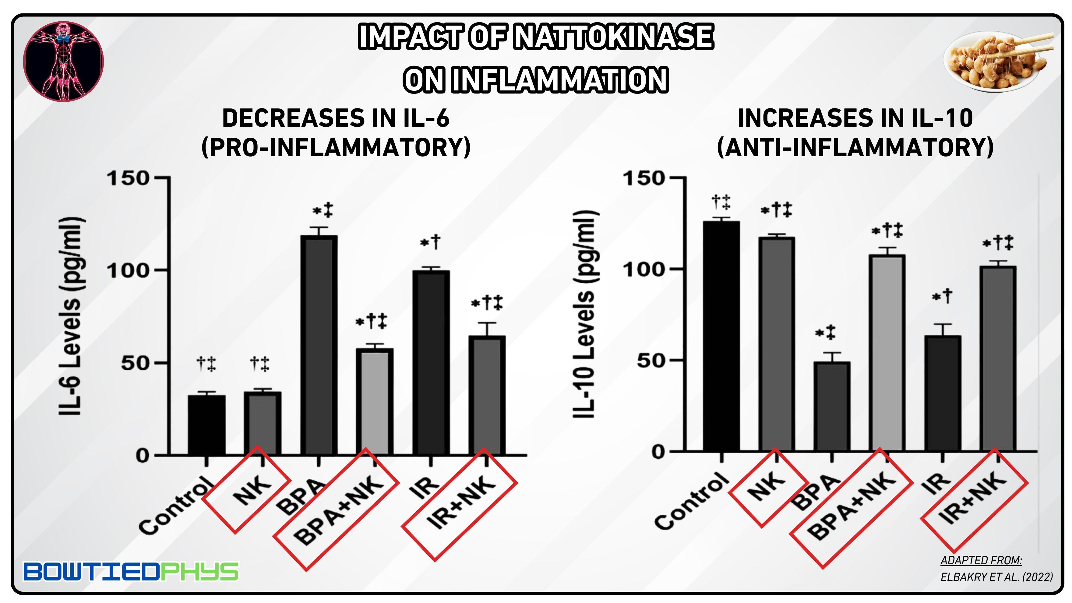In this animal model study, Elbakry et al. (2022)11 nattokinase countered oxidative stress and cellular damage in rats exposed to bisphenol A (BPA) & radiation. It showcased multi-organ protection, improving liver function, reducing systemic oxidative stress & preventing neuronal damage via potent antioxidant mechanisms.