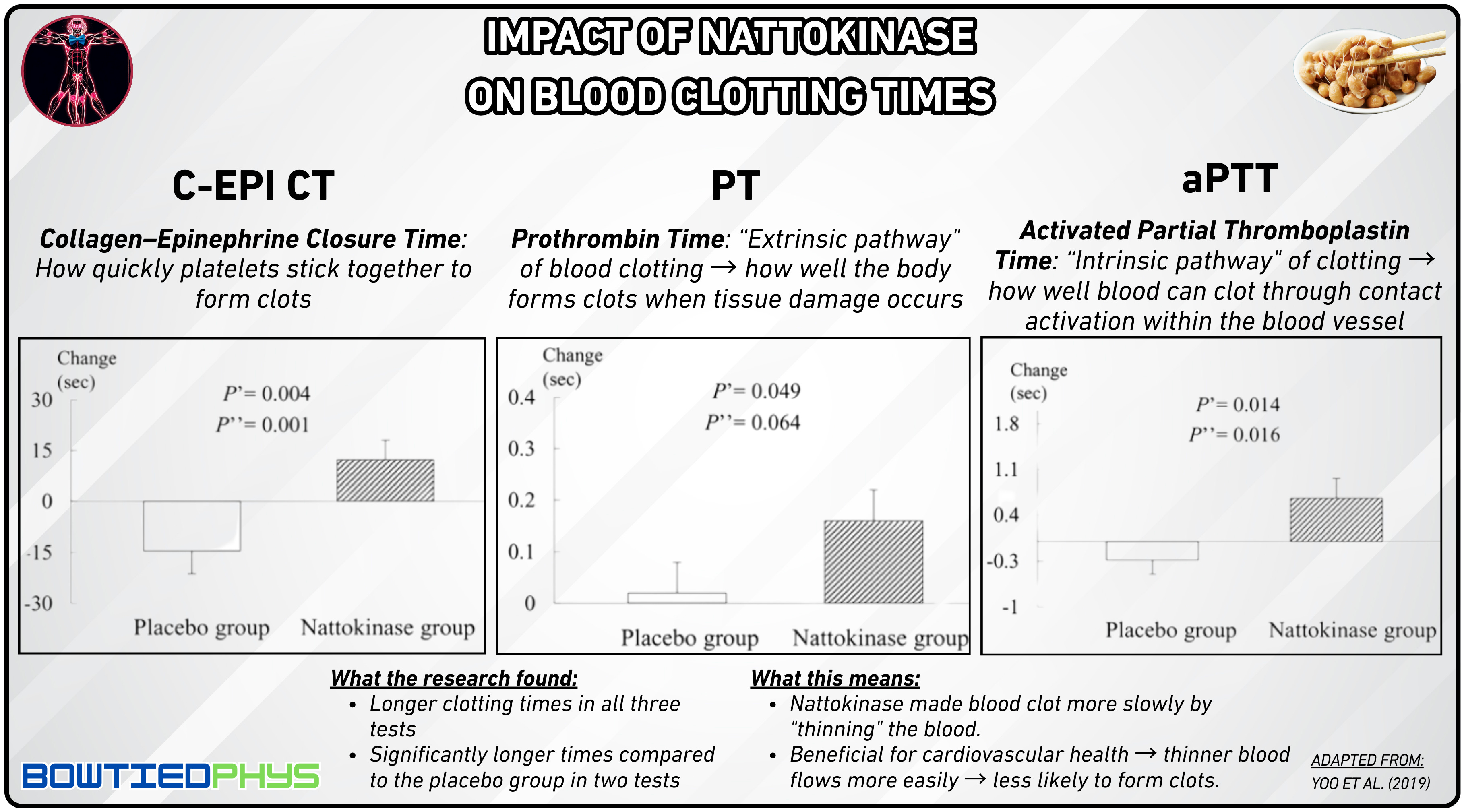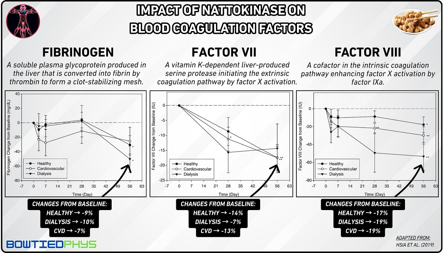 In a randomized, placebo-controlled trial by Yoo et al. (2019)8, 100 participants were split evenly into nattokinase and placebo groups for 8 weeks. The nattokinase group showed significant increases in collagen-epinephrine closure time, prothrombin time, & activated partial thromboplastin time → signaling reduced clotting tendency and enhanced circulation through potent antithrombotic effects.