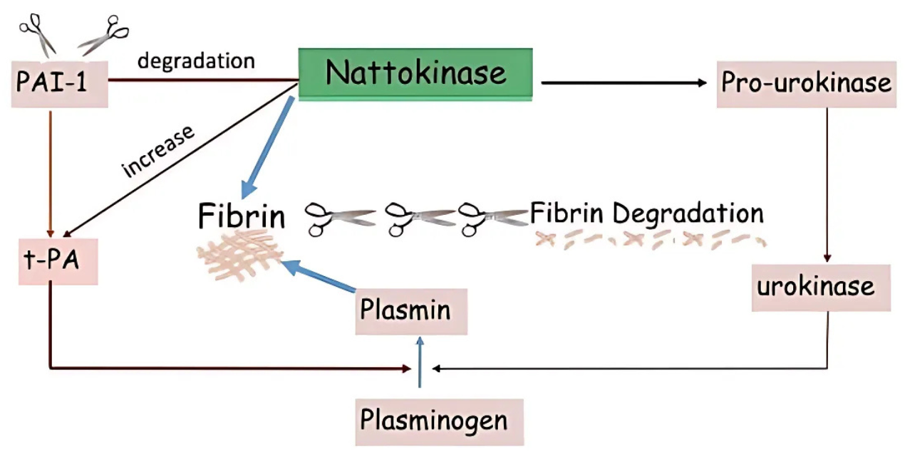 Amplified tPA Activity: Beyond neutralizing PAI-1, nattokinase directly enhances tPA’s efficiency, creating a synergistic increase in plasmin production for faster fibrin dissolution.