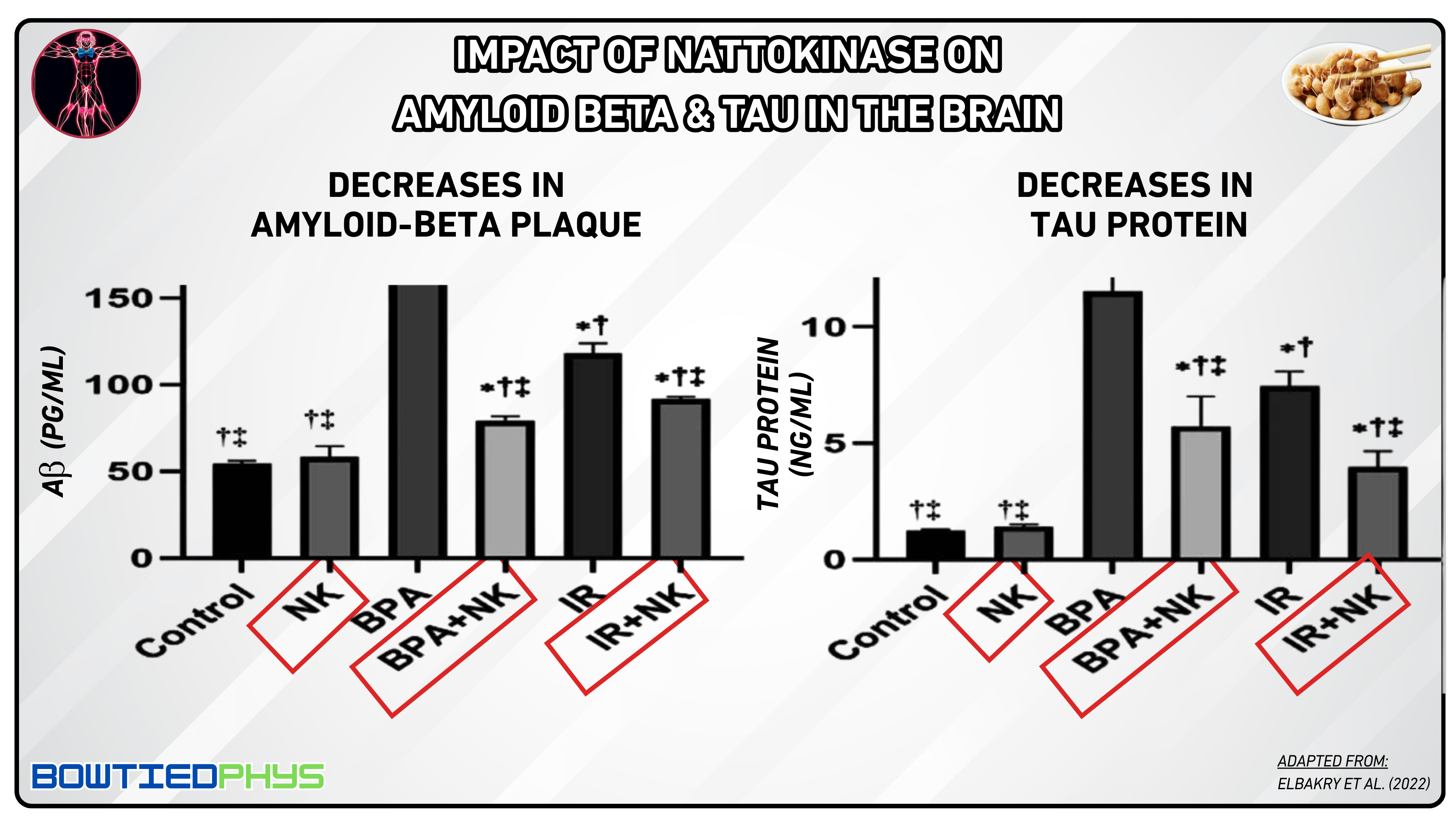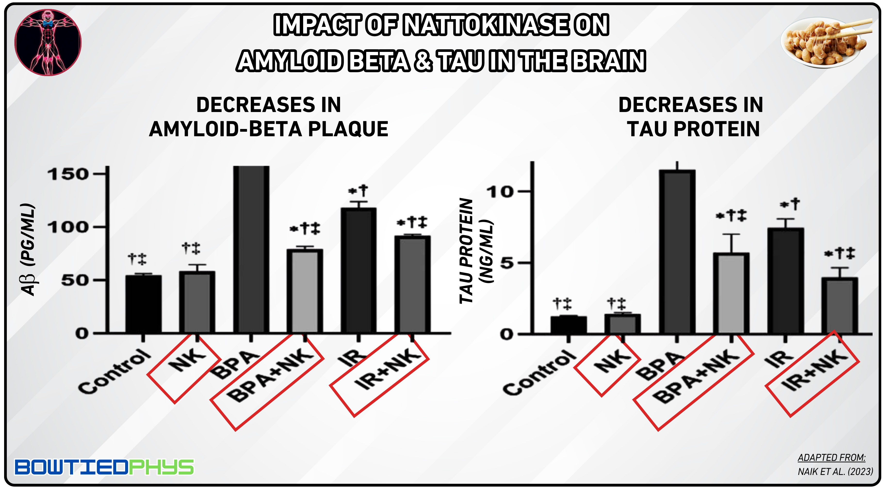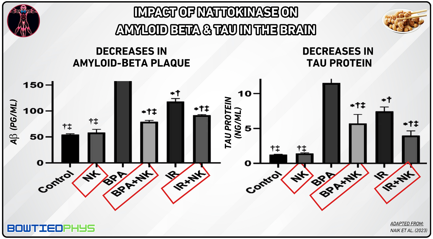 In a mouse study by Naik et al. (2023)12, β-amyloid injections triggered Alzheimer’s-like symptoms (i.e. depression, anxiety, memory loss) alongside elevated inflammatory markers (IL-6, TNF-α) and reduced neuroprotective factors (IL-10, BDNF). Nattokinase treatment (50–100 mg/kg) reversed these, improving behavior/memory, normalizing inflammation & restoring hippocampal BDNF levels, matching the efficacy of donepezil, a standard Alzheimer’s drug.