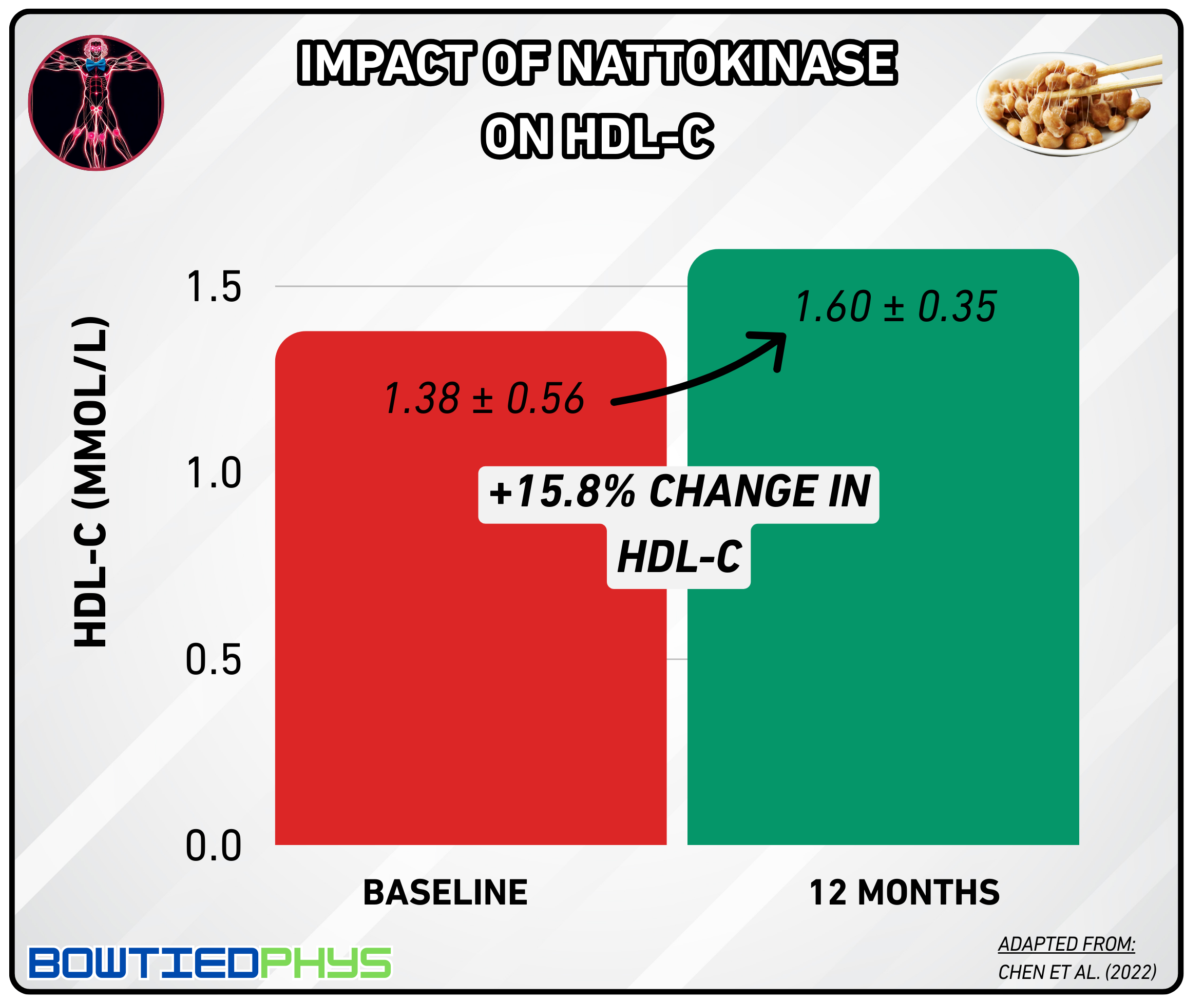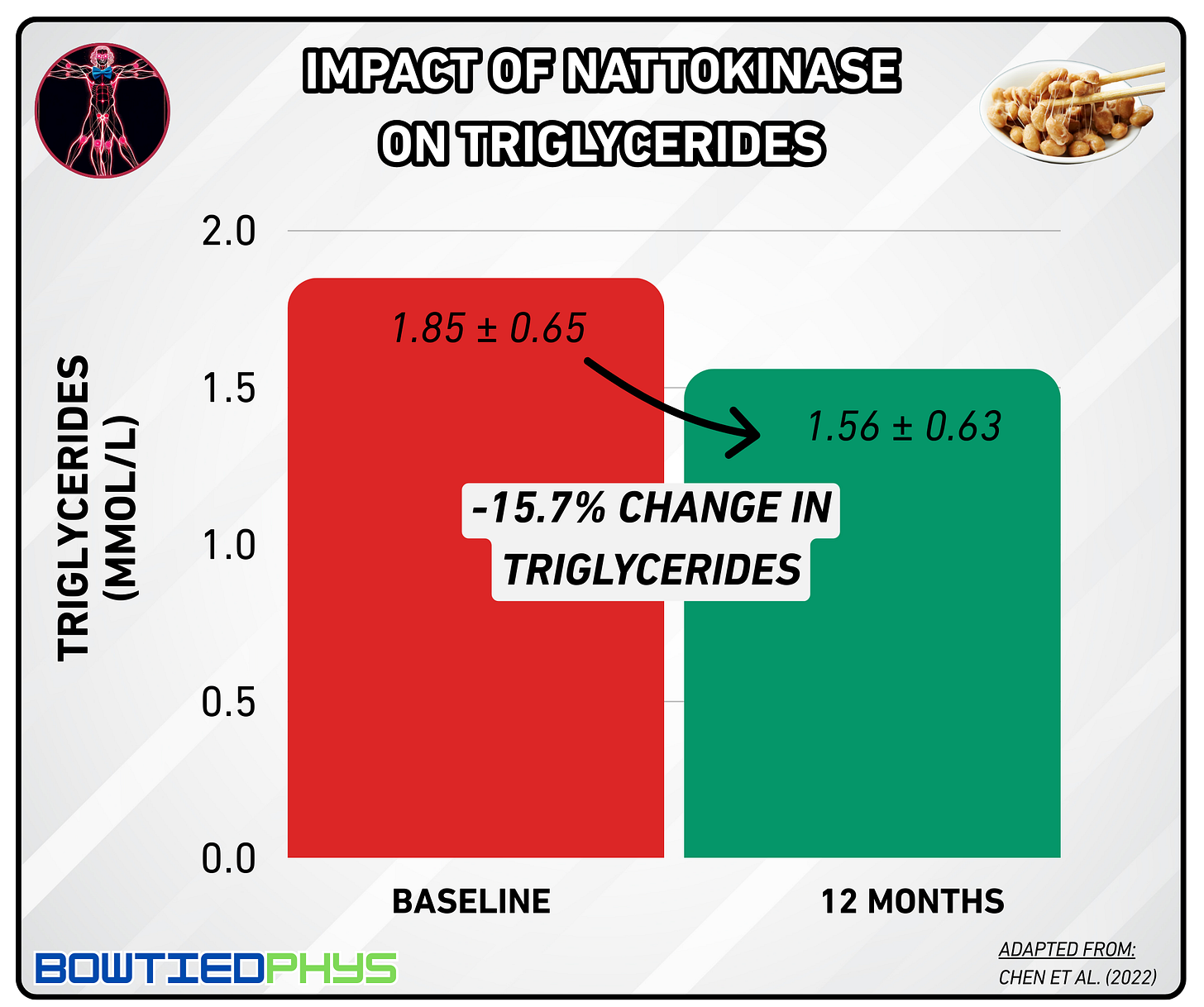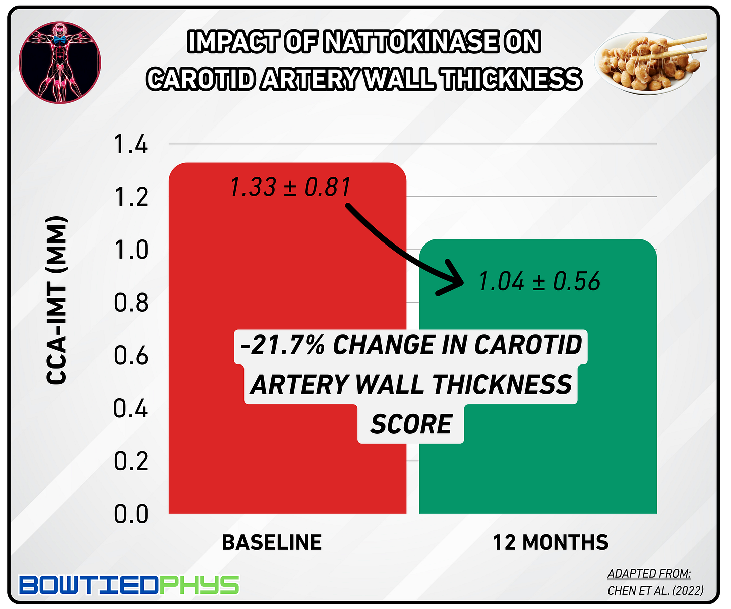 The strongest proof of nattokinase’s cardiovascular benefits comes from a landmark study by Chen et al. (2022)5 → the largest clinical trial conducted to date with 1,062 participants. This robust investigation examined nattokinase's effects on atherosclerosis and dyslipidemia over an extended timeframe.