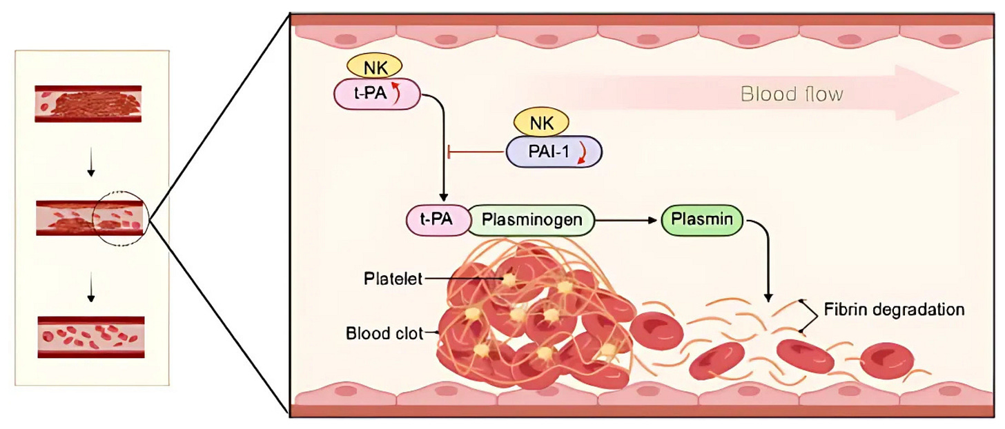 PAI-1 Neutralization: Nattokinase inhibits PAI-1, the key blocker of tissue plasminogen activator (tPA). This boosts tPA’s ability to convert plasminogen into plasmin, the enzyme that degrades fibrin, enhancing clot breakdown.