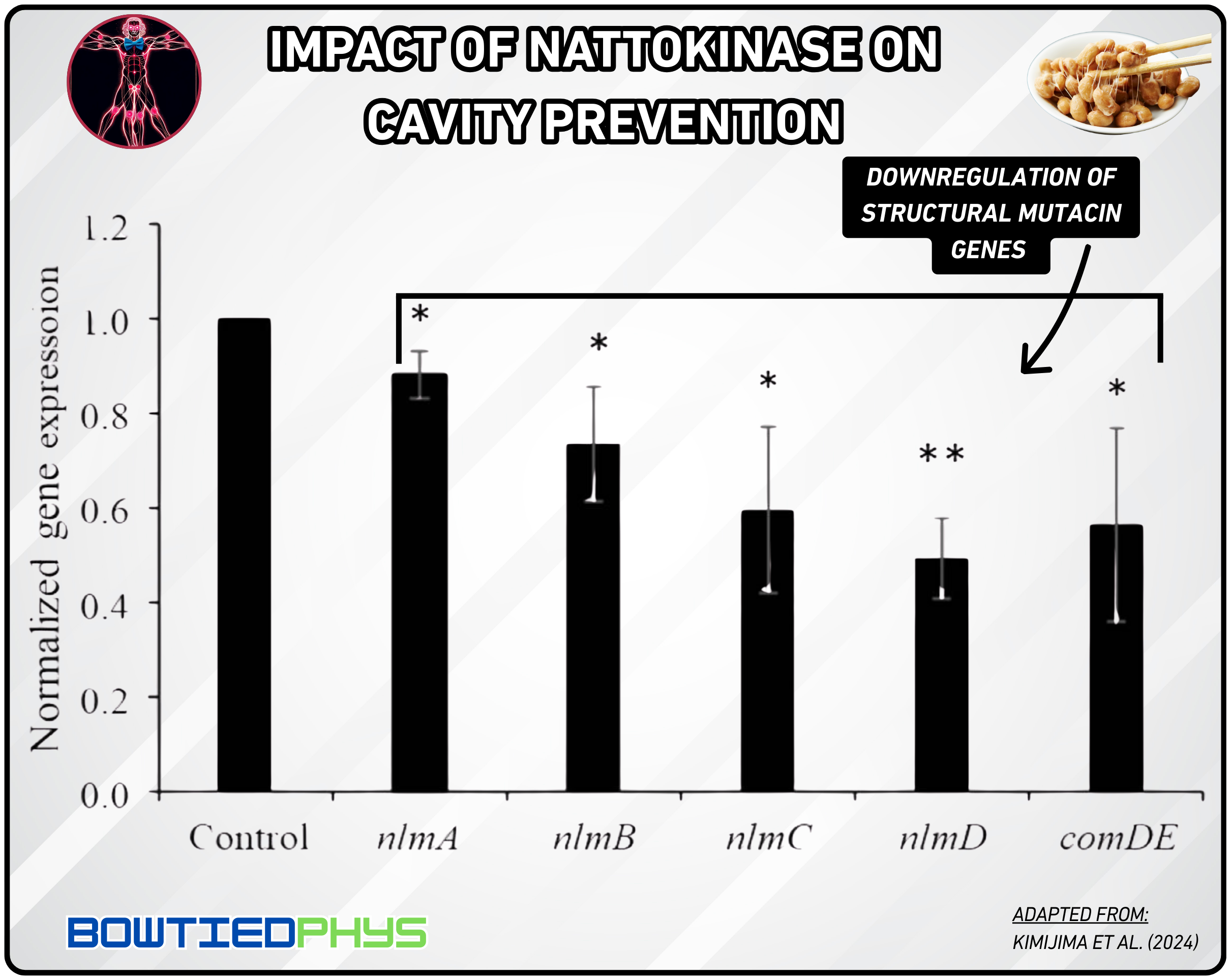 Streptococcus mutans, the main driver of dental caries, forms resilient biofilms and produces mutacins to outcompete other oral bacteria. In a study from Kimijima et al. (2024)15, nattokinase (1 mg/mL) was tested on 46 diverse S. mutans strains from pediatric dental plaque. It significantly suppressed mutacin production across all strains reducing the pathogen’s ability to dominate and form cavities.
