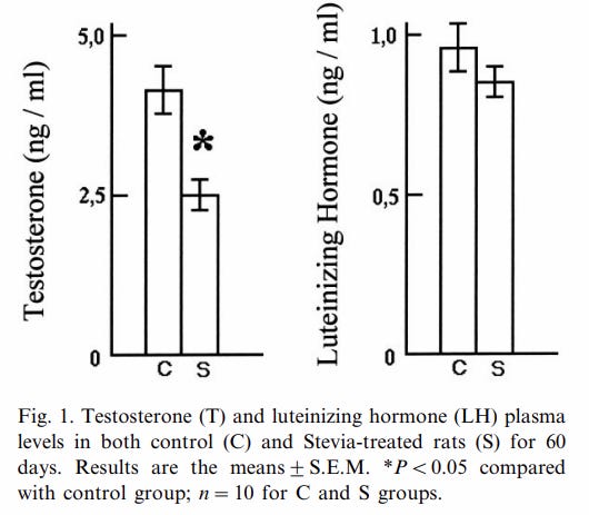 Melis, 1999 → 20 rats given high-dose crude stevia extract (equivalent to ~138g daily for an 175 lb human) for 60 days showed reduced reproductive organ weights, lower testosterone, and decreased sperm concentration.