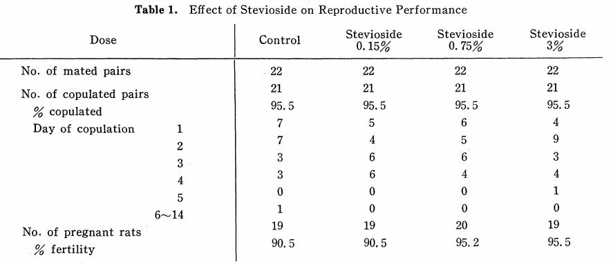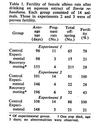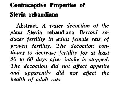 The two biochemistry researchers ran three separate experiments with virgin and proven-fertile rats receiving 5% aqueous Stevia rebaudiana solution. Rats that got the solution experienced a 57% to 79% reduction in fertility with suppressed fertility persisting 50 - 60 days post-treatment.