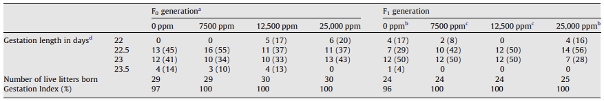 Mori, 1981 → When male rats received treatment of 100-2400 mg/kg (20-400x higher than the acceptable daily intake) for 60 days prior to mating, no adverse effects on reproductive parameters or fetal development manifested.