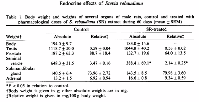 Olivereira Filho, 1989 → Young male rats given stevia extract for 60 days showed only one change: seminal vesicle weight dropped 60%. All other reproductive markers (testosterone, organ weights, sperm parameters) remained normal suggesting no meaningful impact on male fertility.