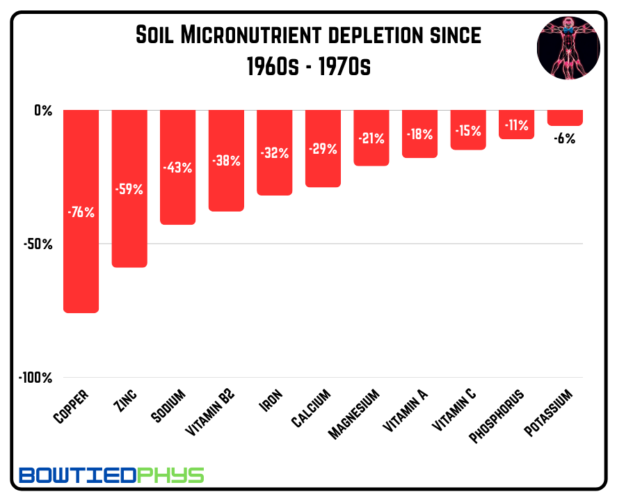 While I’m all for campaigns to make soil fertile again, we need to be realistic. This isn’t happening any time soon. In the meantime, exercise maximum agency over your health & start covering the micronutrient gaps via supplementation. Some of the other big ones I’ll continue to emphasize covering it for large majority: methylated B-vitamins, vitamin C, & a trace mineral complex (zinc, copper, manganese, chromium).