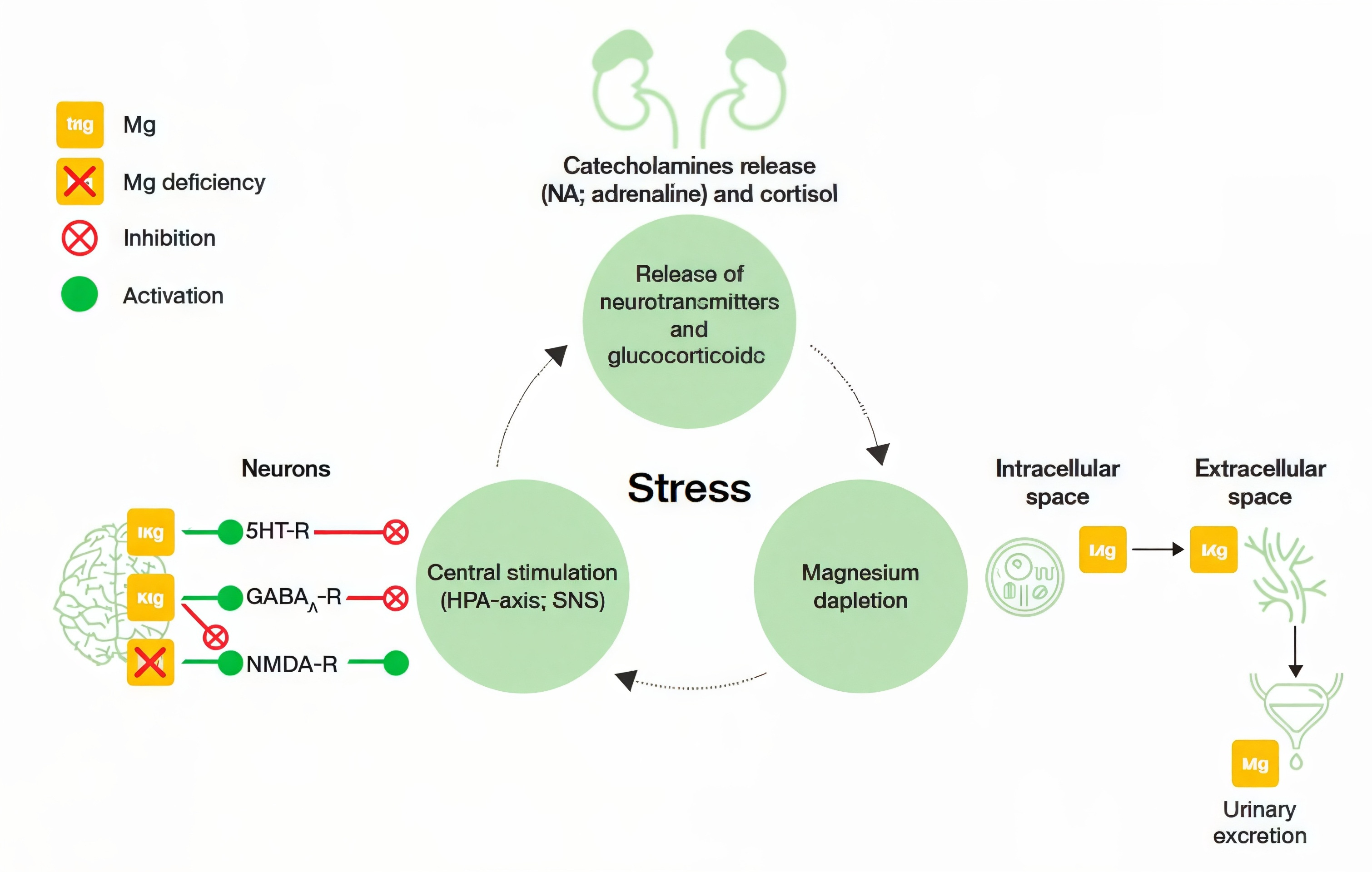 “Vicious Cycle” summarized: Increase in chronic stress states → elevated cortisol + adrenaline → more magnesium depletion → heightened stress susceptibility