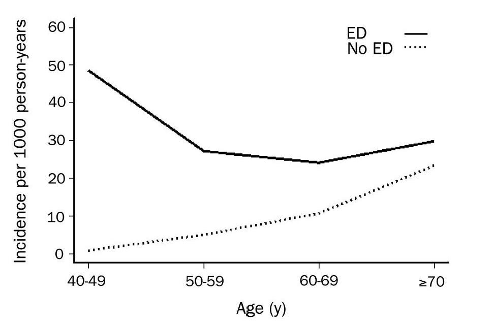 The ED signal becomes even more powerful in younger men. Among men aged 40–49 years, the incidence of heart disease in those with ED was nearly 50 TIMES higher14 than in men without it.