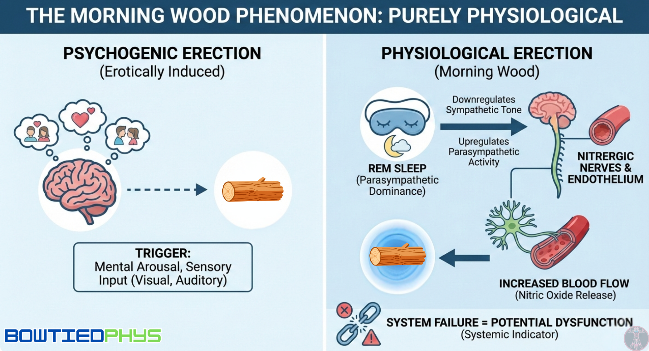 Unlike erotically induced erections that are psychogenic, morning wood is purely physiological. It’s driven by the parasympathetic nervous system and the release of nitric oxide from the endothelium and nitrergic nerves.