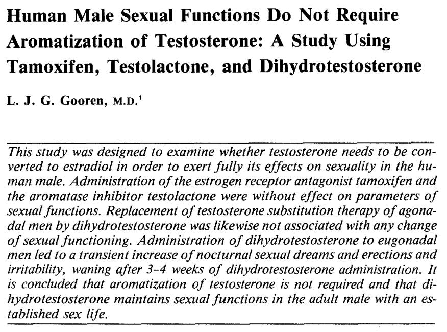 Gooren LJ. Human male sexual functions do not require aromatization of testosterone: a study using tamoxifen, testolactone, and dihydrotestosterone. Arch Sex Behav. 1985 Dec;14(6):539-48. doi: 10.1007/BF01541754. PMID: 4084053.