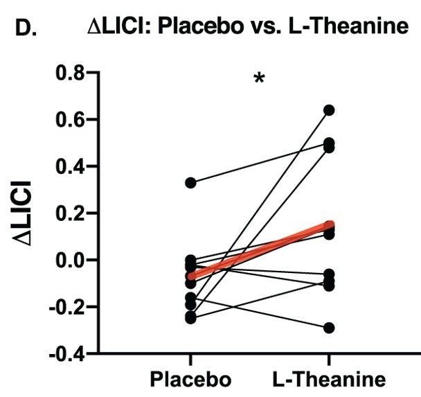 A 10-subject placebo-controlled, randomized double-blind crossover study tested the efficacy of L-theanine along. Each subject received a single 400 mg oral dose of L-theanine or placebo on two separate visits at least 72 hours apart. 30 minutes after taking L-theanine, subjects had significantly greater increases in intracortical facilitation (ICF) & long-interval intracortical inhibition (LICI) compared to placebo.