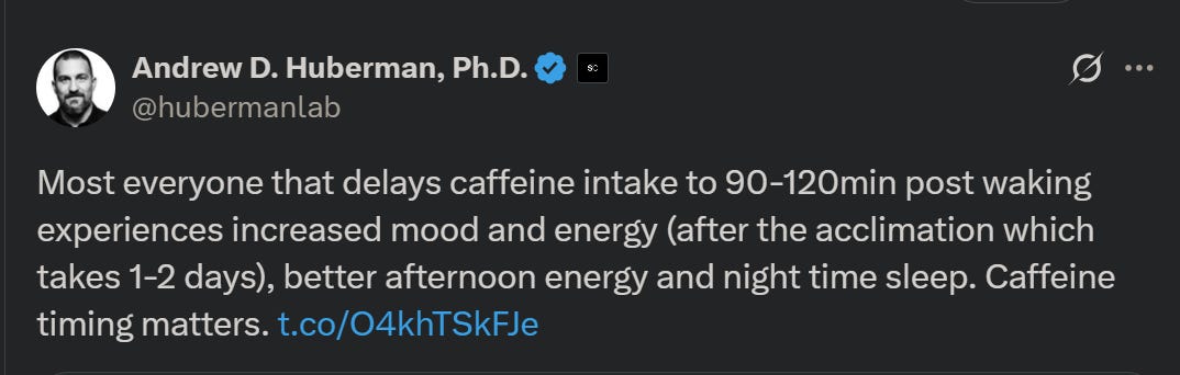 For most people, delaying caffeine 90–120 minutes after waking provides minimal to no benefit. The evidence doesn’t support the proposed mechanisms as universal truths. Though — context & biochemical individuality are paramount.