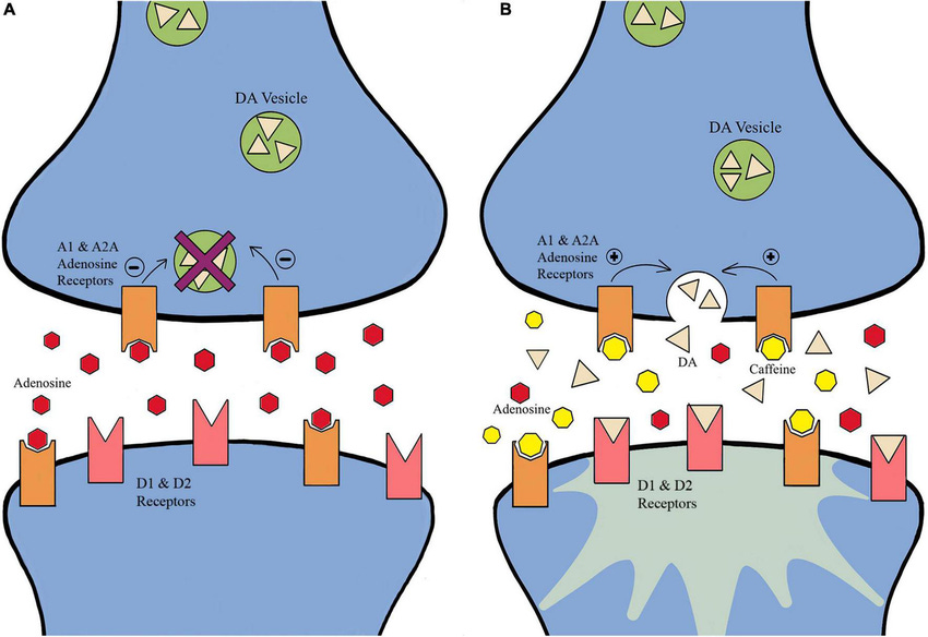 Caffeine works by blocking adenosine receptors1 (A1 & A2A), preventing adenosine from inhibiting arousal neurons. As a result, we get: amplified dopamine release, enhanced glutamatergic transmission, heightened alertness, & improved cognitive performance.