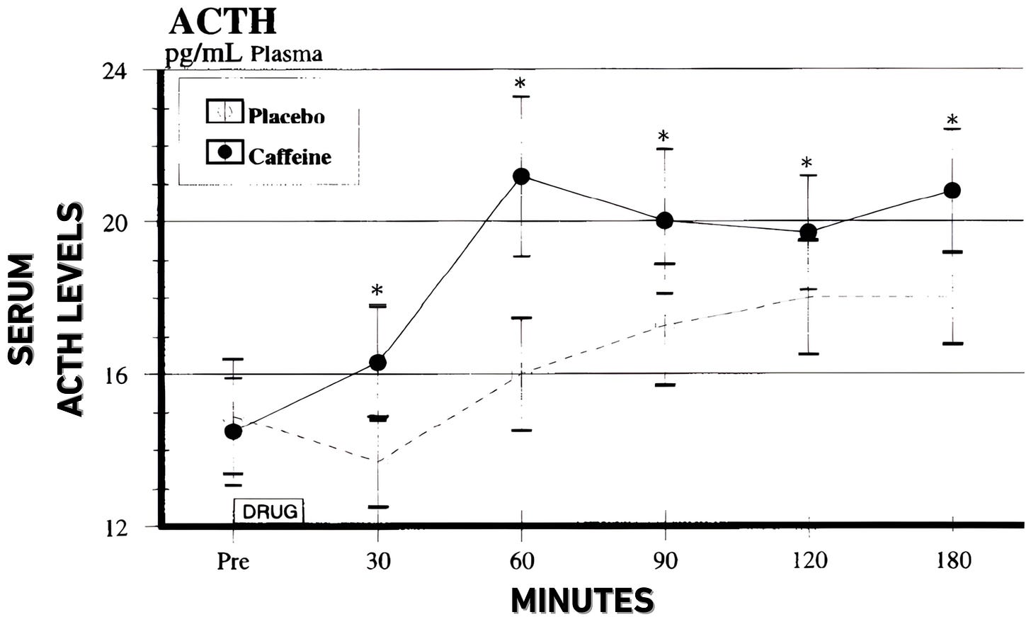 Lovallo WR, Al’Absi M, Blick K, Whitsett TL, Wilson MF. Stress-like adrenocorticotropin responses to caffeine in young healthy men. Pharmacol Biochem Behav. 1996 Nov;55(3):365-9. doi: 10.1016/s0091-3057(96)00105-0. PMID: 8951977.