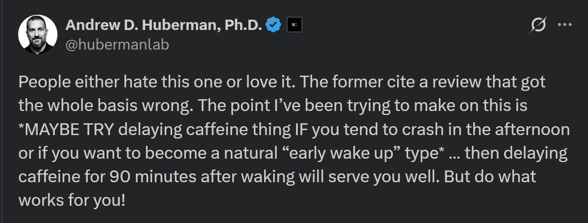 Since then, it’s become even more controversial. But the issue is less about Huberman’s recommendation. After all, it’s a suggestion to test and I’ve found him consistently espousing the same principle we advocate for so strongly here: take what fits, leave what doesn’t.